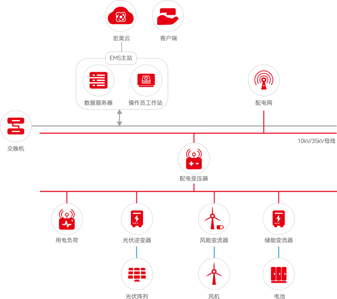 mile米乐集团风光储一体化解决方案是融合物联网技术,将风能、太阳能、储能以及EMS能源管理系统结合起来,实现风、光、储多能互补协同运行,能源精准调配减少弃风弃光,提高能源综合效率,同时通过调峰、调频和调相等功能,有效抑制电网波动,提升电网稳定性、可靠性。